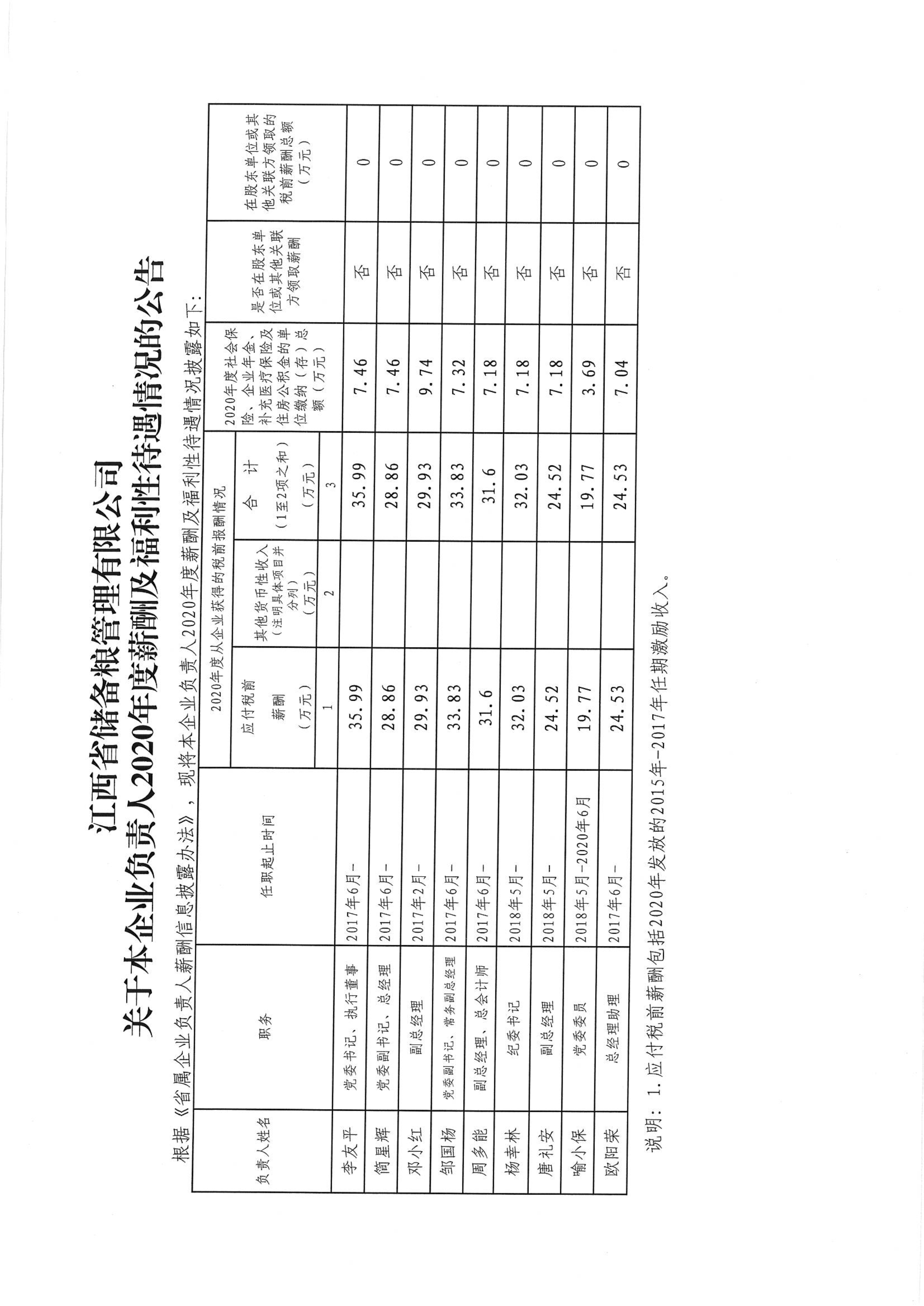 江西省储备粮公司企业负责人2020年度薪酬及福利性待遇情况公告